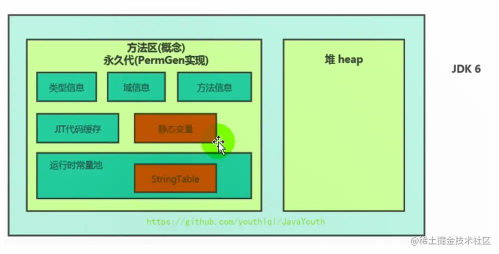 1、jdk6中:在字符串常量池(此时在永久代)中创建一个字符串"ab"