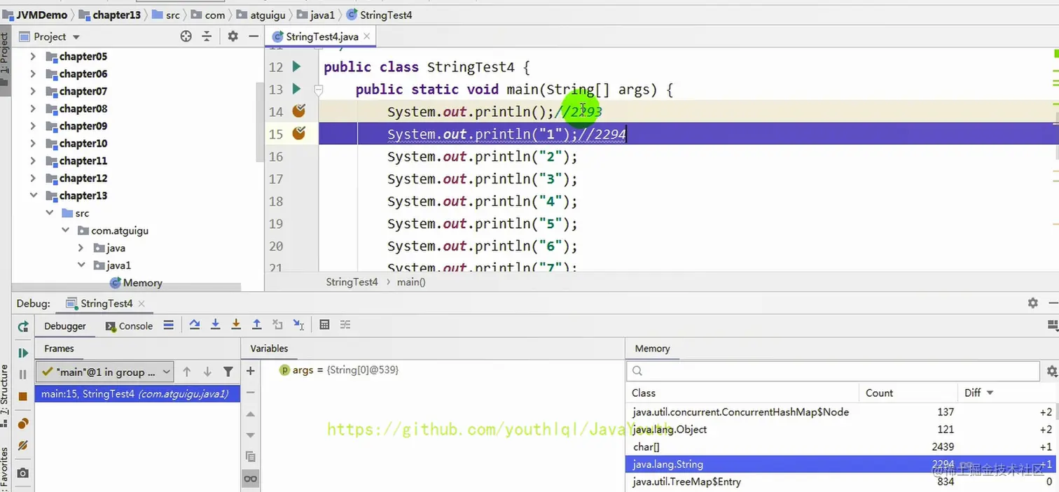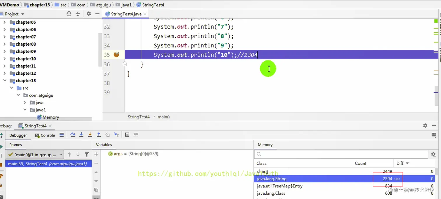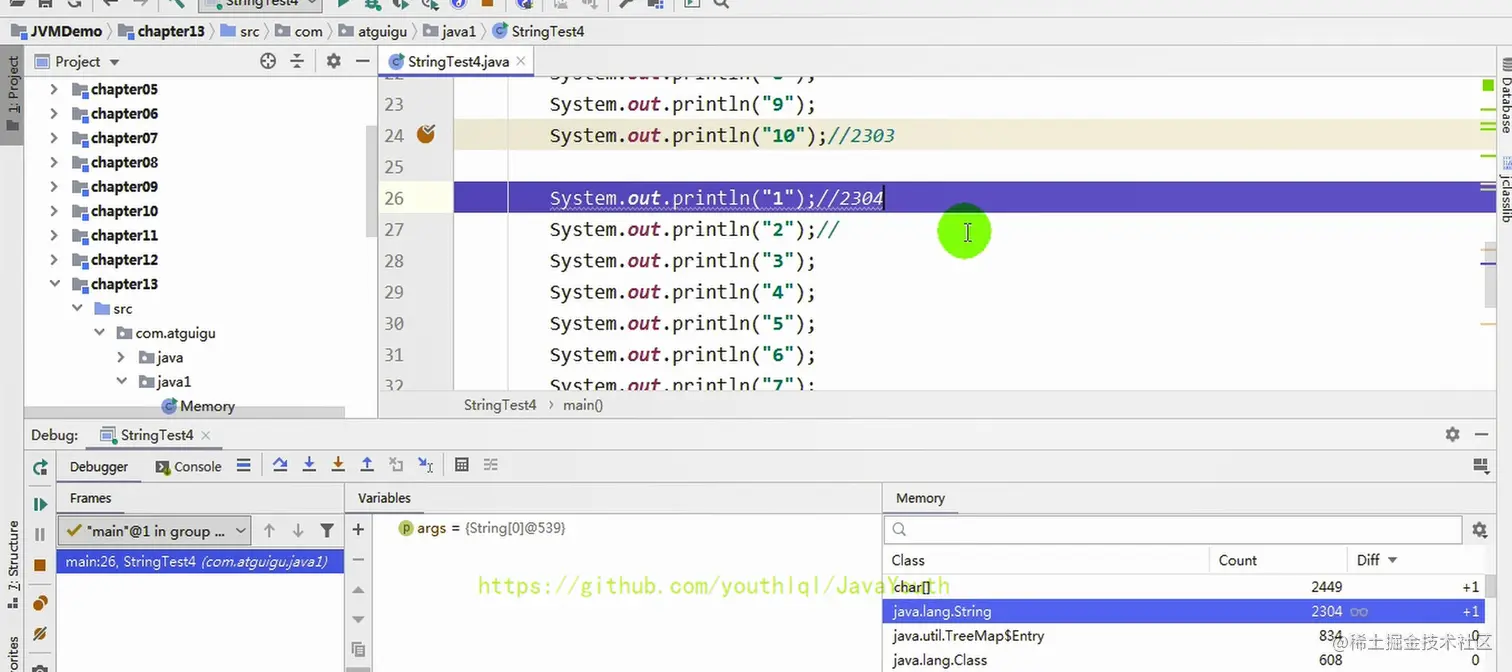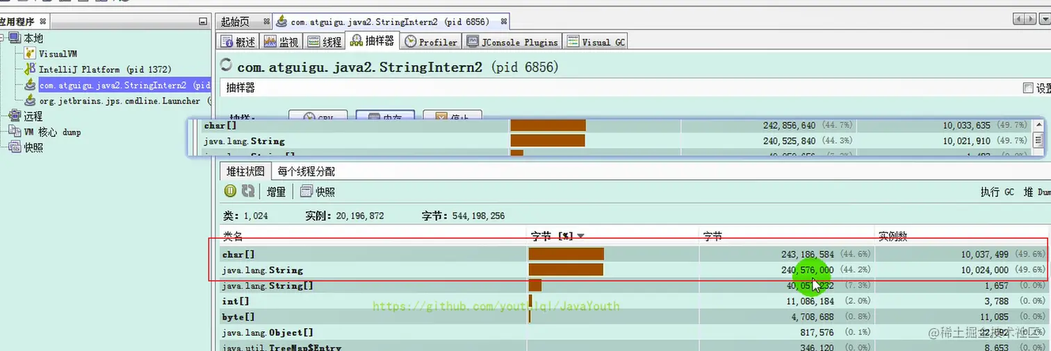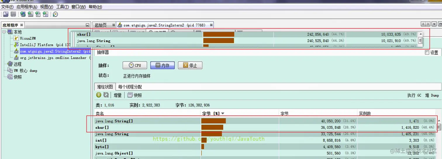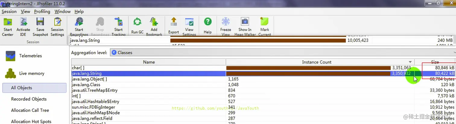 2、使用 intern() 方法:由于数组中字符串的引用都指向字符串常量池中的字符串,所以程序需要维护的 String 对象更少,内存占用也更低