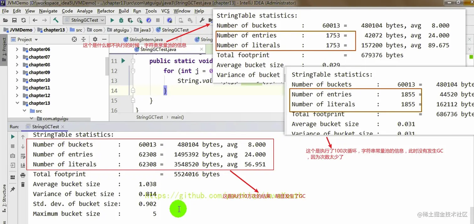 - 以上两点均说明 StringTable 区发生了垃圾回收