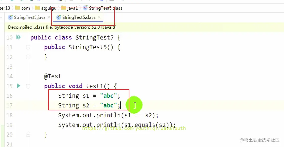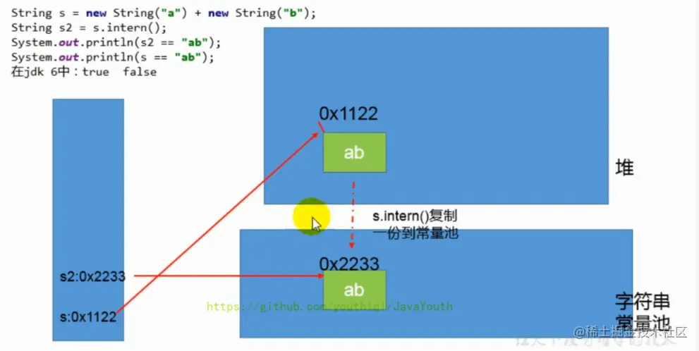 String s1 = new String("ab");//执行完以后,会在字符串常量池中会生成"ab"