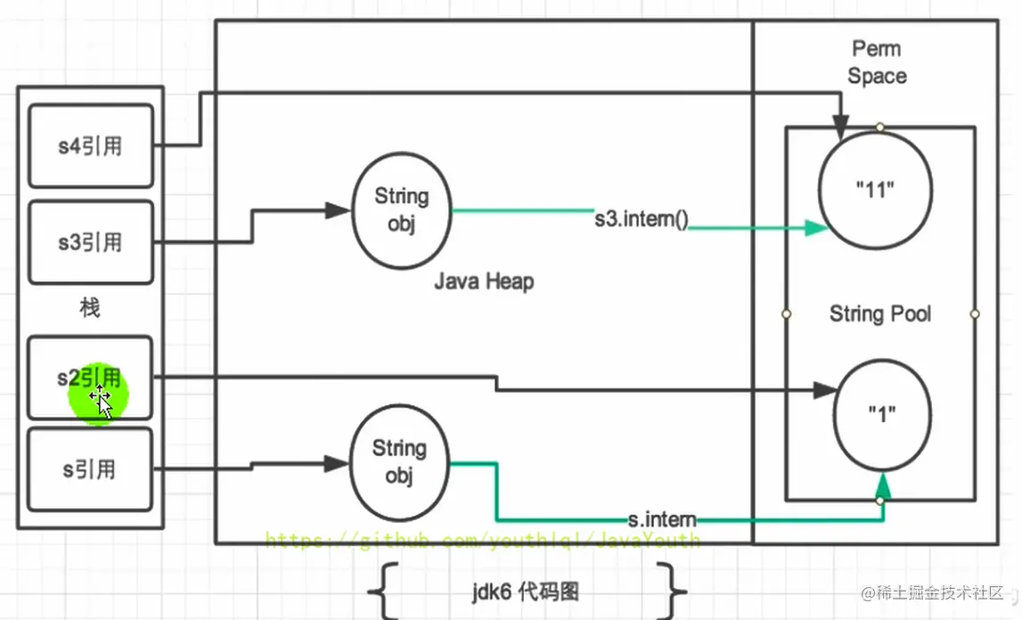 //调用了intern()方法使用了字符串常量池里的字符串,那么前面堆里的字符串便会被GC掉,这也是intern省内存的关键原因
