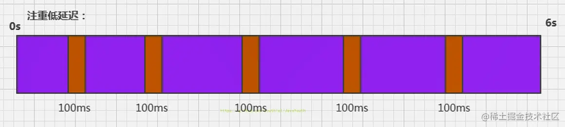 暂停时间优先,意味着尽可能让单次STW的时间最短:0.1+0.1 + 0.1+ 0.1+ 0.1=0.5,但是总的GC时间可能会长