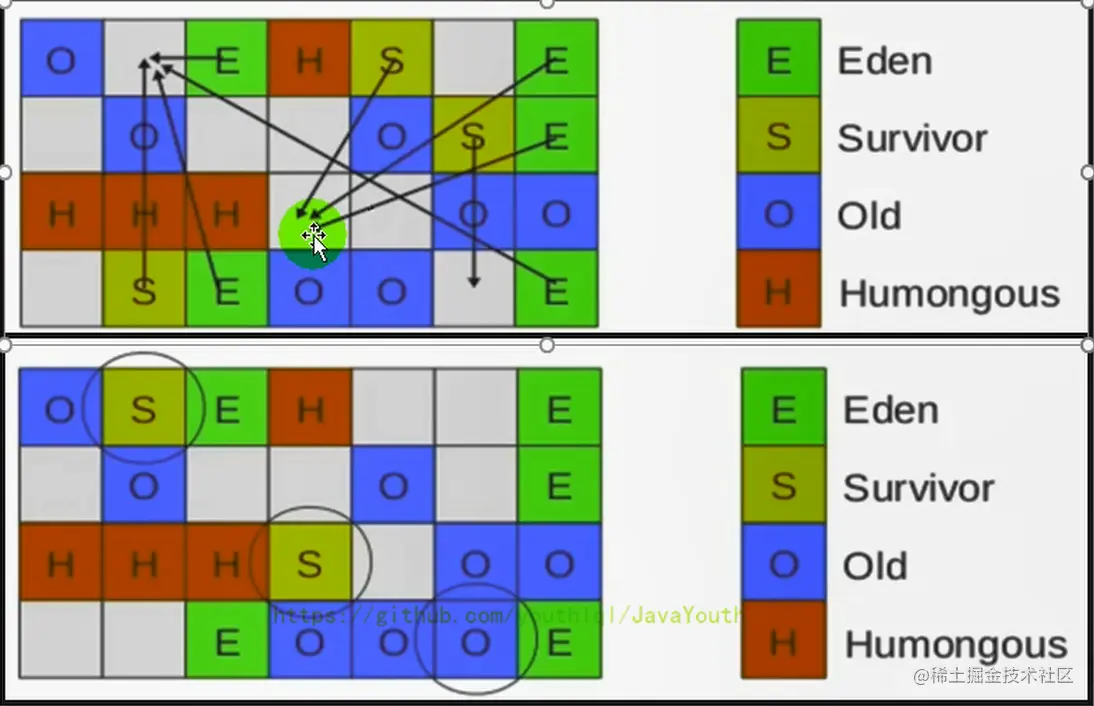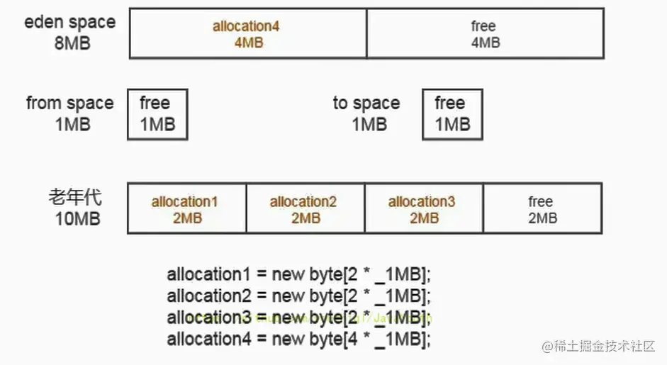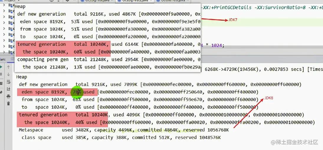 与 JDK7 不同的是,JDK8 直接判定 4M 的数组为大对象,直接怼到老年区去了