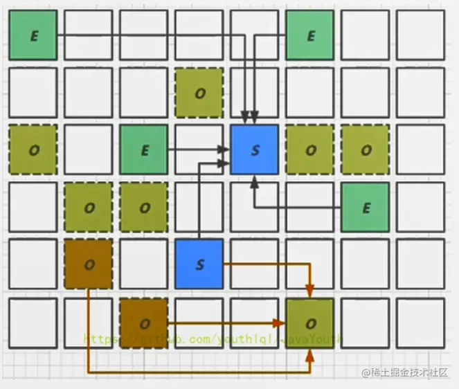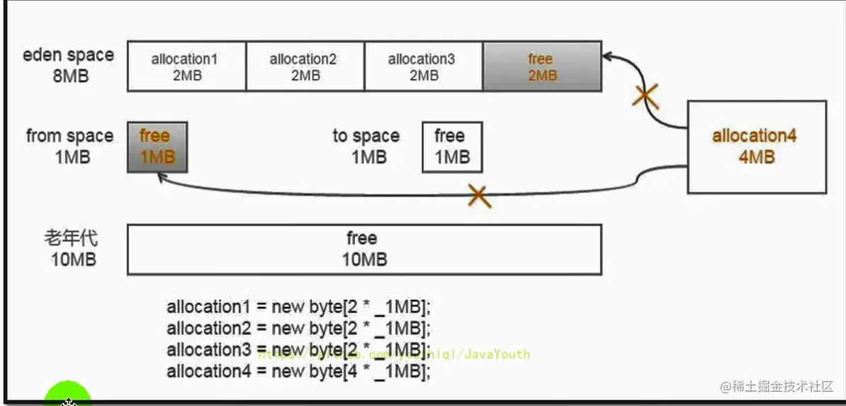 1、首先我们会将3个2M的数组存放到Eden区,然后后面4M的数组来了后,将无法存储,因为Eden区只剩下2M的剩余空间了,那么将会进行一次Young GC操作,将原来Eden区的内容,存放到Survivor区,但是Survivor区也存放不下,那么就会直接晋级存入Old 区