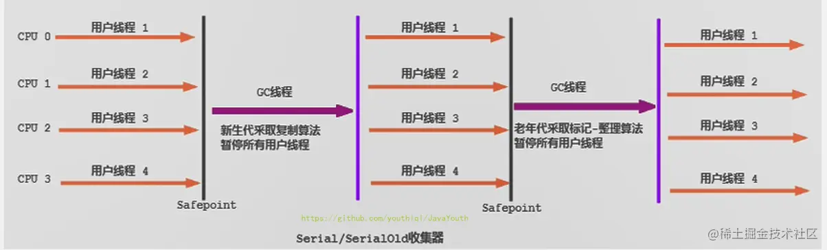 串行回收指的是在同一时间段内只允许有一个CPU用于执行垃圾回收操作,此时工作线程被暂停,直至垃圾收集工作结束。