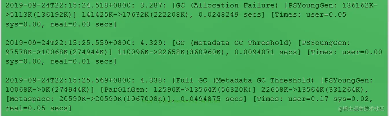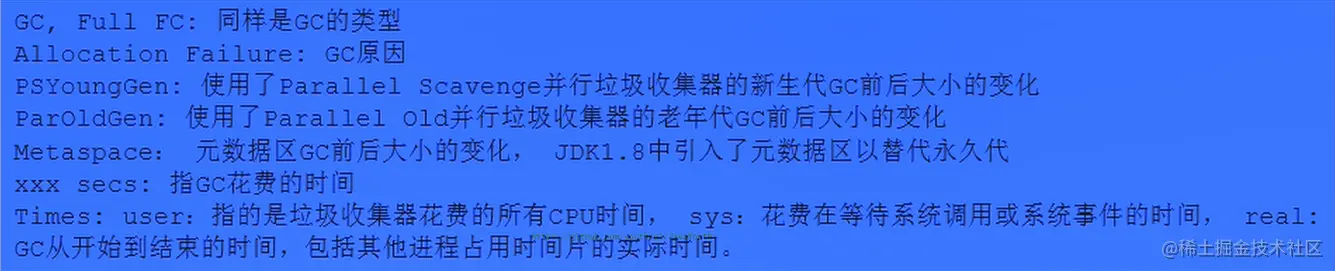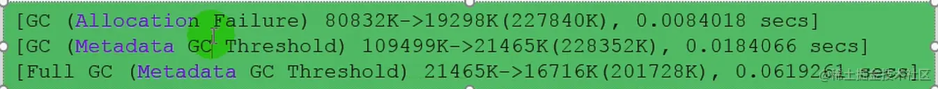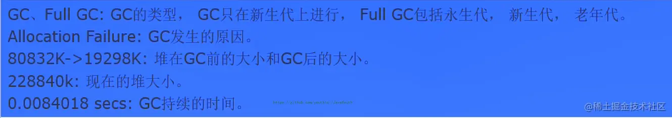 Allocation Failure表明本次引起GC的原因是因为在年轻代中没有足够的空间能够存储新的数据了。