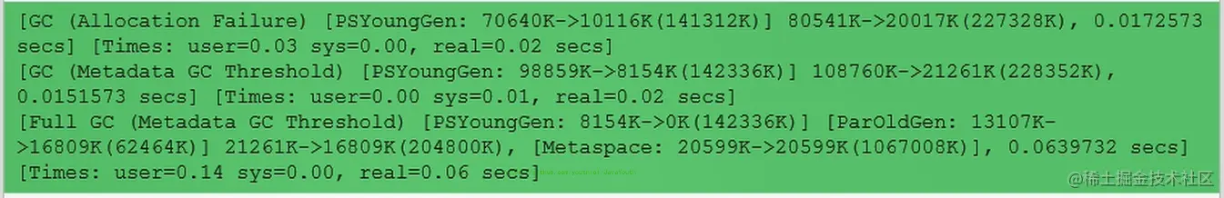 - 括号外:GC回收前年轻代和老年代大小,回收后大小,(年轻代和老年代总大小)