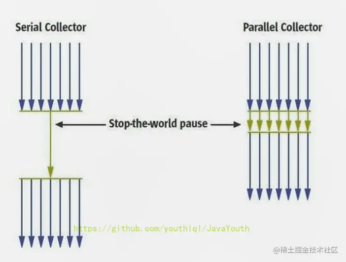- 在并发能力比较强的CPU上,并行回收器产生的停顿时间要短于串行回收器
