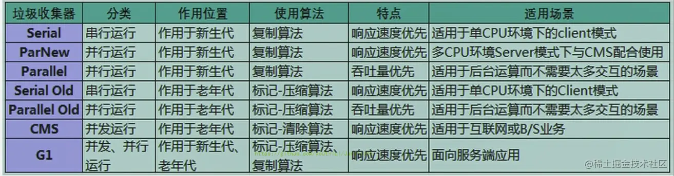 - 虽然我们会对各个收集器进行比较,但并非为了挑选一个最好的收集器出来。没有一种放之四海皆准、任何场景下都适用的完美收集器存在,更加没有万能的收集器。所以我们选择的只是对具体应用最合适的收集器。