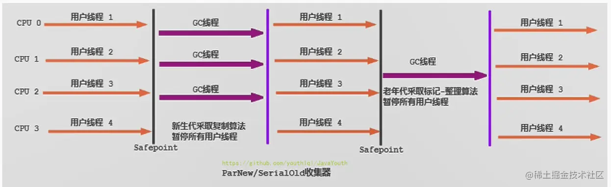 - 1999年随JDK1.3.1一起来的是串行方式的Serial GC,它是第一款GC。ParNew垃圾收集器是Serial收集器的多线程版本