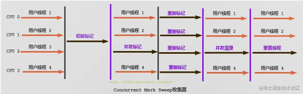 - 并发式垃圾回收器与应用程序线程交替工作,以尽可能减少应用程序的停顿时间。