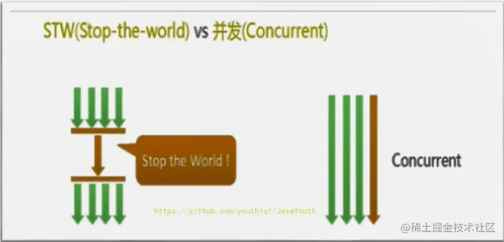 - 例如,GC期间100毫秒的暂停时间意味着在这100毫秒期间内没有应用程序线程是活动的