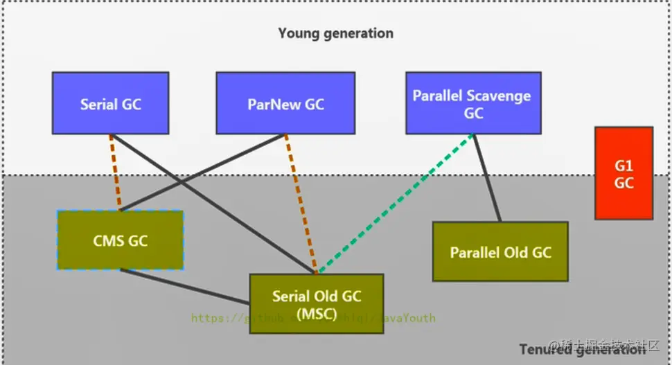 - 为什么要有很多收集器,一个不够吗?因为Java的使用场景很多,移动端,服务器等。所以就需要针对不同的场景,提供不同的垃圾收集器,提高垃圾收集的性能。