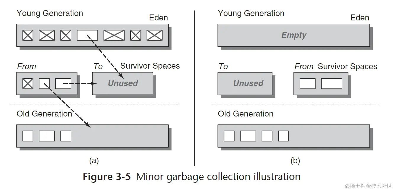 此外,如果在次要垃圾回收期间老年代变满并且无法将更多对象复制到其中,那么次要垃圾回收通常会在次要垃圾回收之后进行完整垃圾回收,它会收集整个 Java 堆。这称为提升失败。