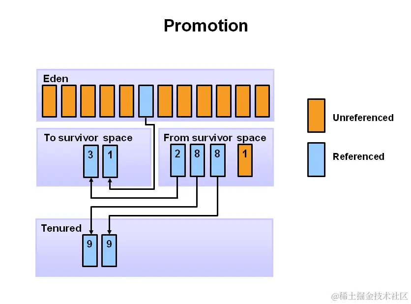 需要指出的是,在次要垃圾回收期间,不能保证分配的survival空间总是足够大以容纳来自Eden空间和其他survival空间的幸存对象。如果溢出了,剩下的需要被疏散的对象就会被移到老年代。这被称为过早提升(premature promotion)。它会导致年轻对象进入老年代并助长老年代的增长,这会导致严重的性能问题。