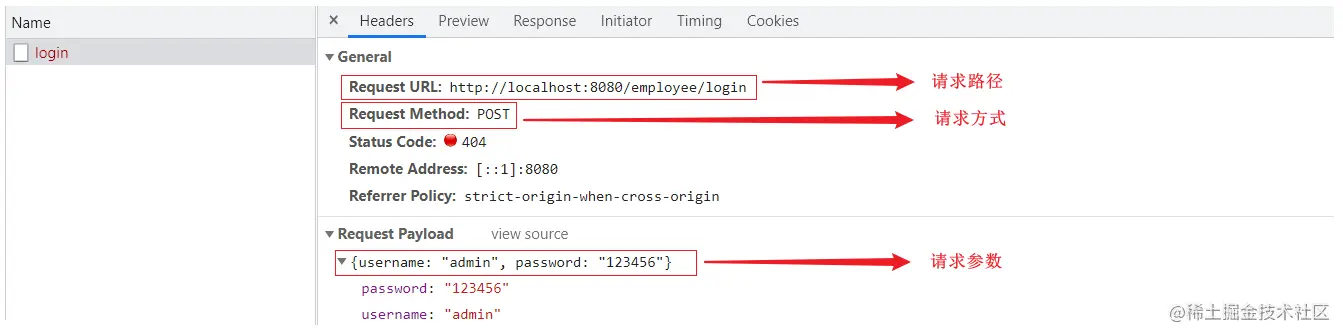 通过浏览器调试工具(F12),可以发现,点击登录按钮时,页面会发送请求(请求地址为http://localhost:8080/employee/login)并提交参数 username和password, 请求参数为json格式数据编辑。