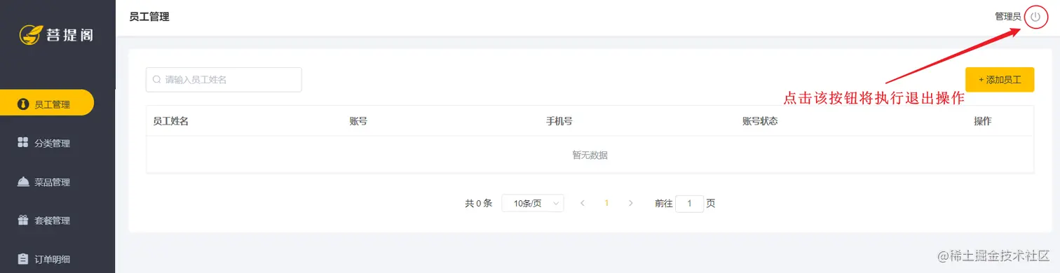 如果员工需要退出系统,直接点击右侧的退出按钮即可退出系统,退出系统后页面应跳转回登录页面。