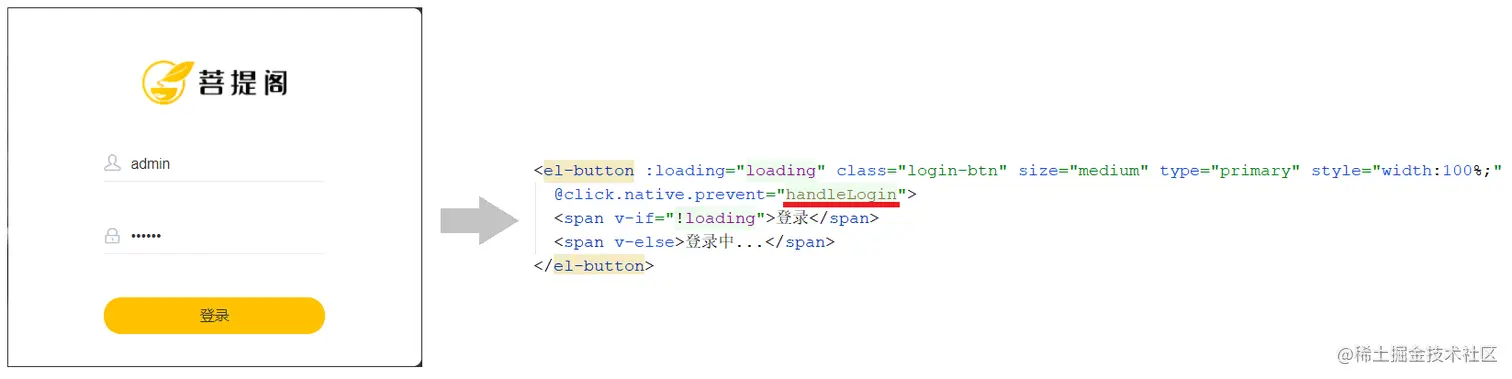 当点击 "登录" 按钮, 会触发Vue中定义的 handleLogin 方法: