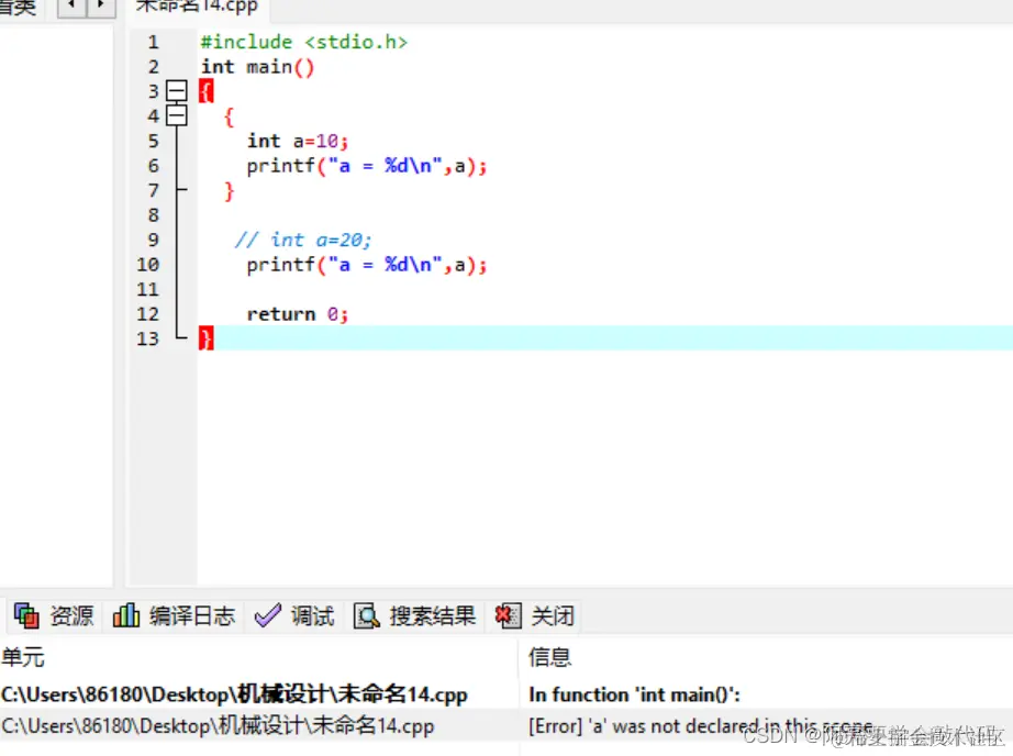 通过上面的代码和图片,我们就能够清晰地知道变量的作用域和生命周期。只要局部变量出了它的作用域,并且没有再次定义,那么程序就会报错。
