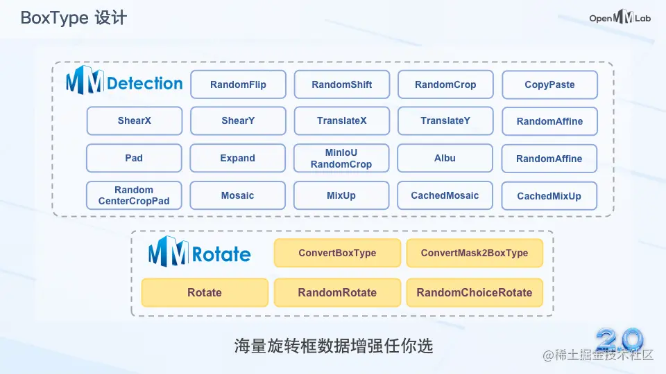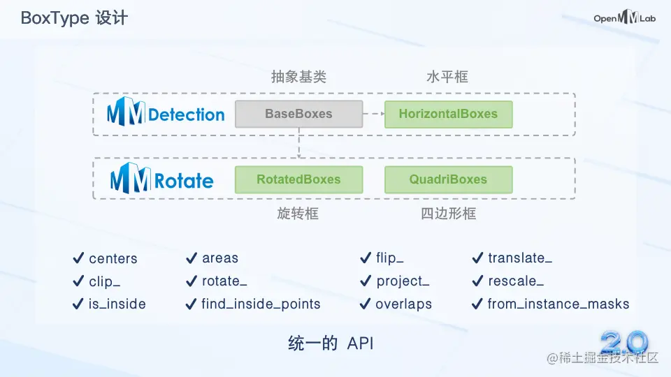 在 OpenMMLab 2.0 中,我们对不同类型的 Box (水平框/旋转框/四边形框) 进行了抽象,统一了 MMDetection 3.x 和 MMRotate 1.x 中不同类型边界框的用法,以简化实现并减少冗余代码。