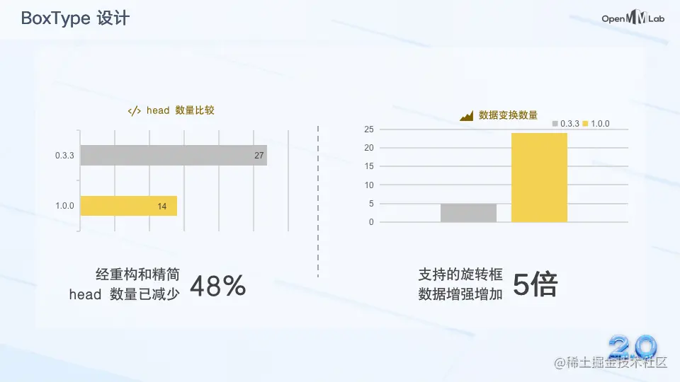 通过对 MMDetection 3.x 中的相关 head 进行 BoxType 升级,用户在 MMRotate 1.x 中不需要对 head 进行任何修改和继承就能直接支持旋转框模型,显著减少了 head 的数量。