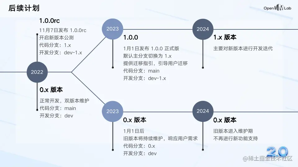 我们将在 2023 年 1 月 1 日正式发布 MMRotate 1.0.0 版本到主分支,对新版本感兴趣的同学可以使用 dev-1.x 分支来体验我们的全新版本。我们将在未来保持双分支的同时维护,主要维护时间线如下所示: