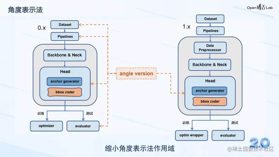 为了减轻用户的负担,我们将角度表示法的作用范围限定在了 head 内部。用户只需要修改 anchor_generator 和 bbox_coder 两个组件就可以完成对旋转框模型角度表示法的切换,不再需要关心其他地方的角度表示法。