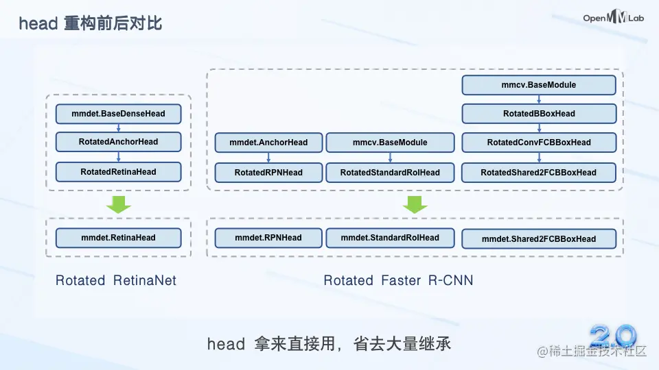以 Rotated RetinaNet 和 Rotated Faster R-CNN 为例,过去我们需要针对旋转框对 MMDetection 中的 head 进行一些修改和继承才能使其支持旋转框模型。