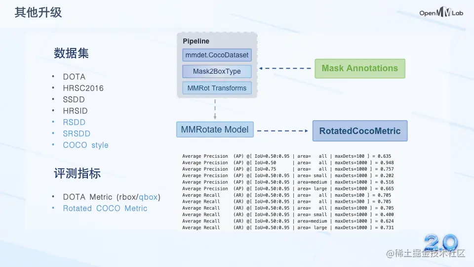 Mask2BoxType 数据增强模块会将 mask 格式的标注转换成旋转框或者多边形框标注。在评测指标方面,我们不仅新增了对四边形框的支持,还支持了更为详尽的 COCO 格式的旋转框指标。