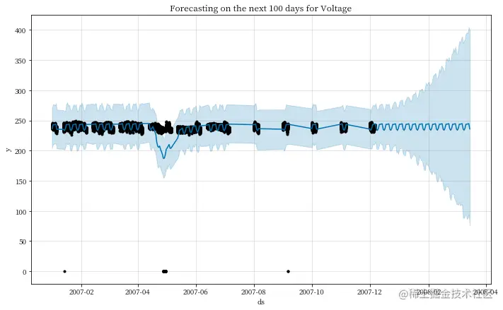 prophet_forecaster(df, x='Date', y='Voltage', period=100)