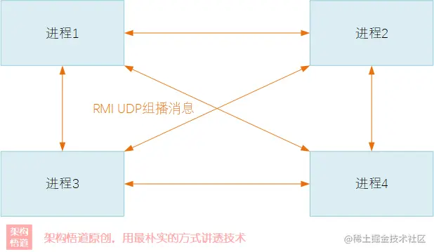 JGroups的方式其实和RMI有点类似。JGroups是一个开源的群组通讯工具,可以用来创建一个组,这个组中的成员可以给其他成员发送消息。其工作模式基于IP组播(IP multicast),但可以在可靠性和群组成员管理上进行扩展,而且JGroups的架构上设计非常灵活,提供可以兼容多种协议的协议栈。