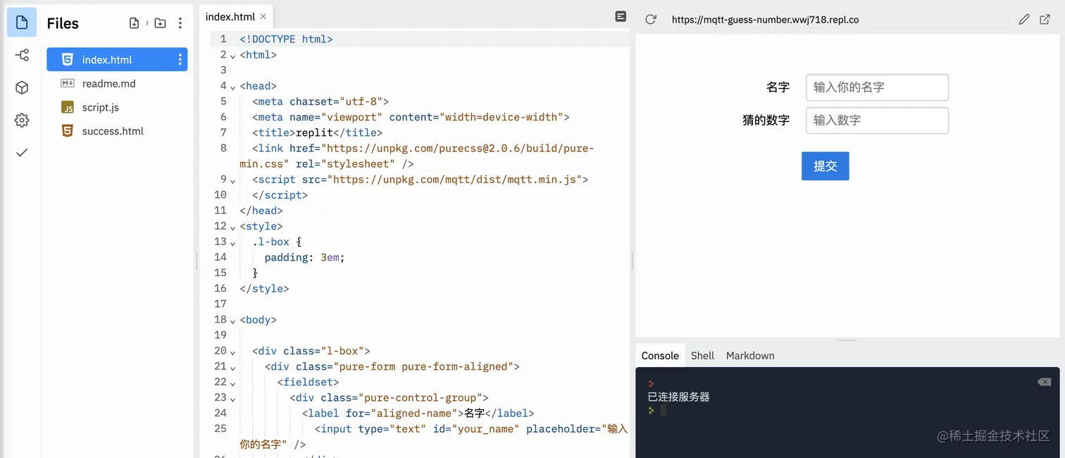 前端要做的事情相当简单,只需准备一个表单,让用户可以填写 Ta的名字和猜的数字,然后用MQTT发给后端即可。
