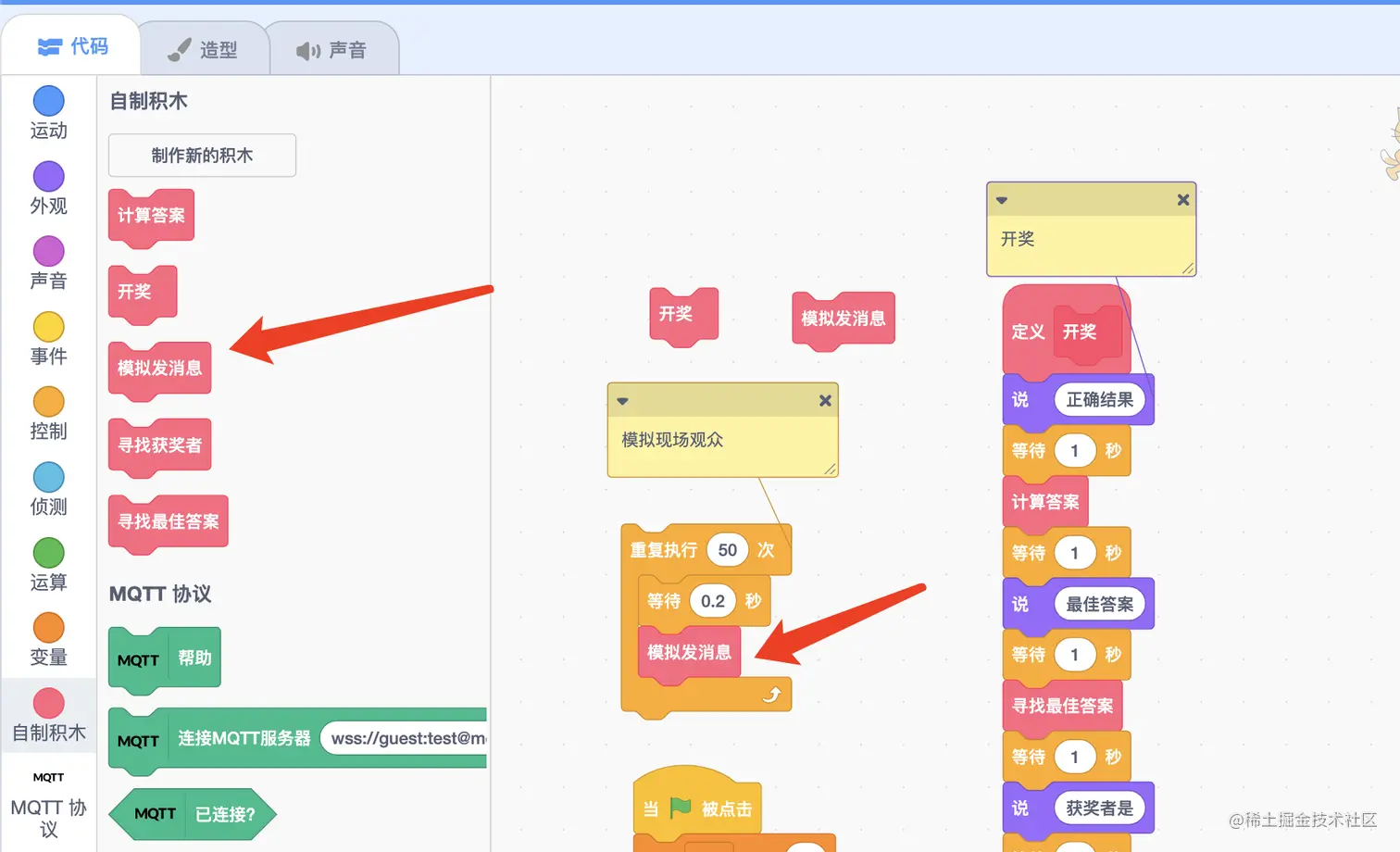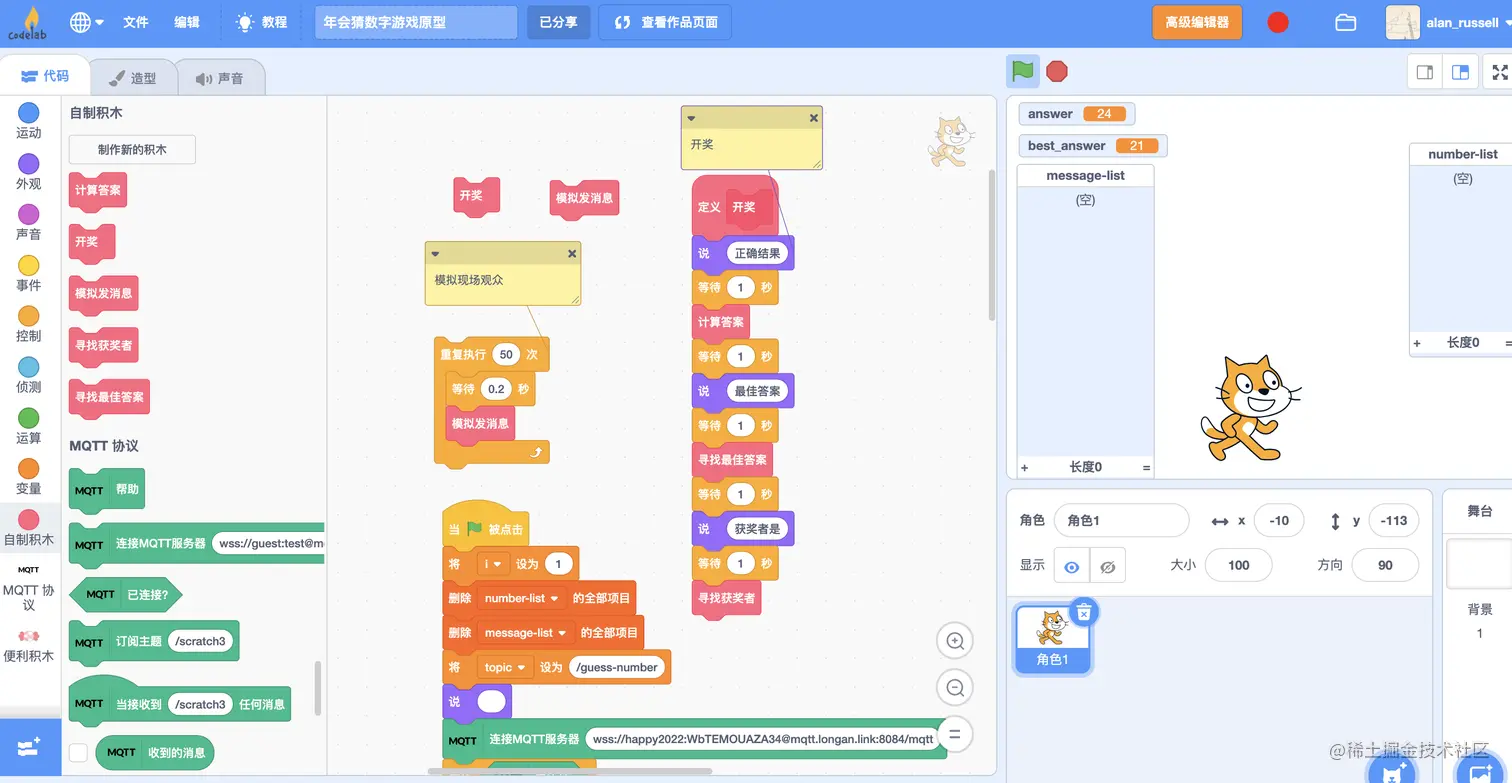 这个 Scratch 程序充当抽奖程序的后端,是的!完全运行在浏览器里的后端!后端并不一定要运行在服务器上(那是相当狭义的概念) :)