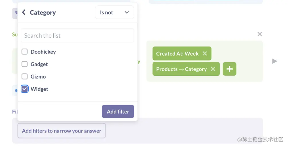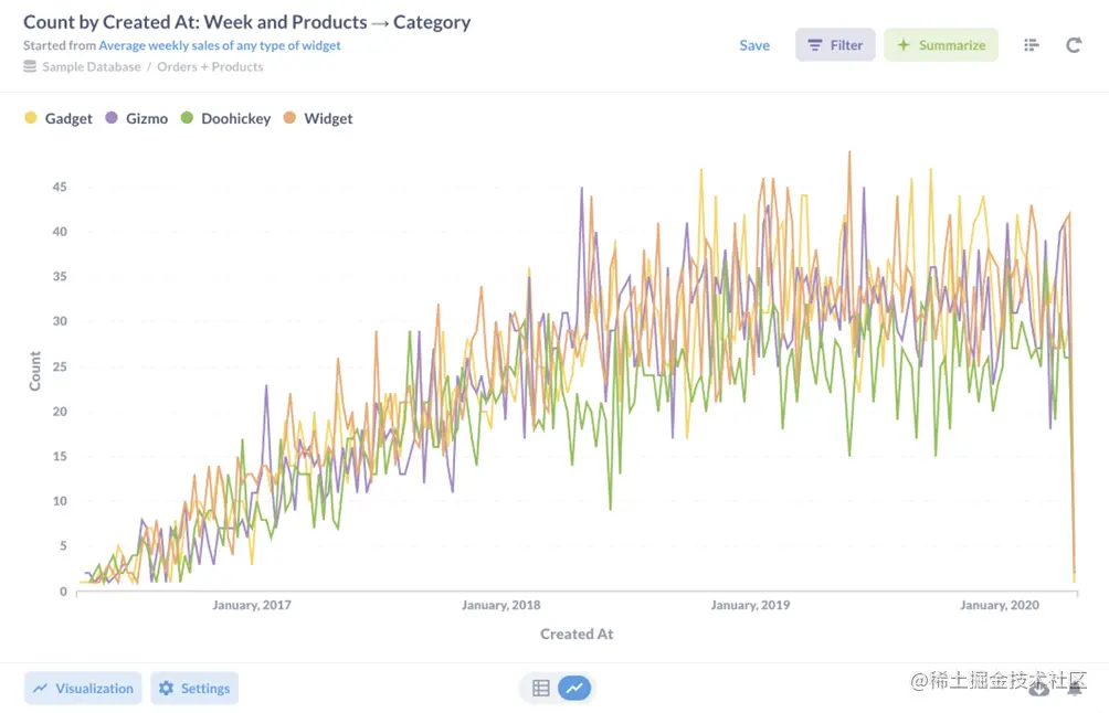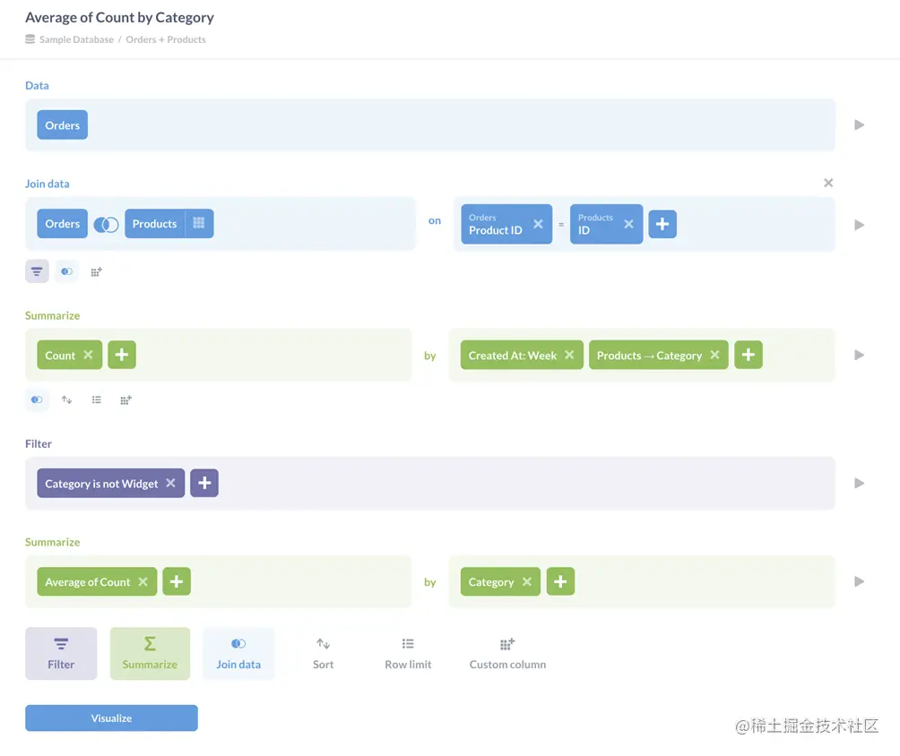 不过,查询并不一定要到此为止:Metabase允许您一步一步地添加更多的过滤器和计算更多的摘要。为了了解这是如何工作的,让我们跟踪分析人员可能要经历的步骤,同时探究每种类别的商品每周售出多少。