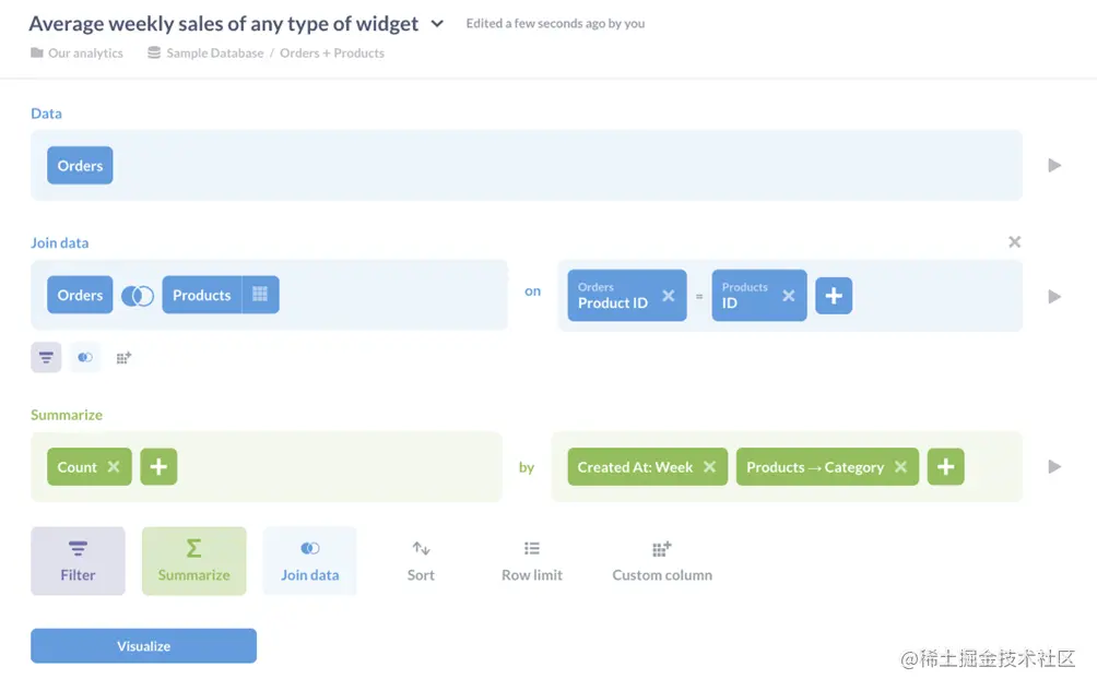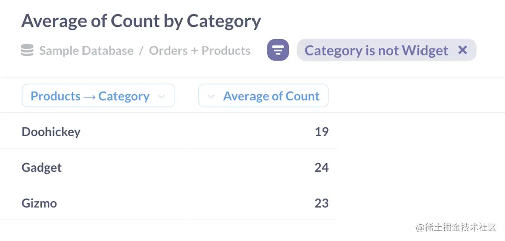 还有其他方法可以计算这个结果:例如,我们可以在计算第一个摘要之前过滤掉小部件(大多数分析师认为这是一个最佳实践,因为在早期减小数据集的大小可以提高性能)。重要的一课是,我们可以一步一步地构建洞察力,因为每个答案都指向一个新问题,而Metabase允许我们在操作发生时逐个添加操作。我们不必事先计划好所有事情:如果我们发现我们总是从相同的操作开始,我们可以单独保存这些操作,如本文所述SQL代码片段与保存的问题与视图.