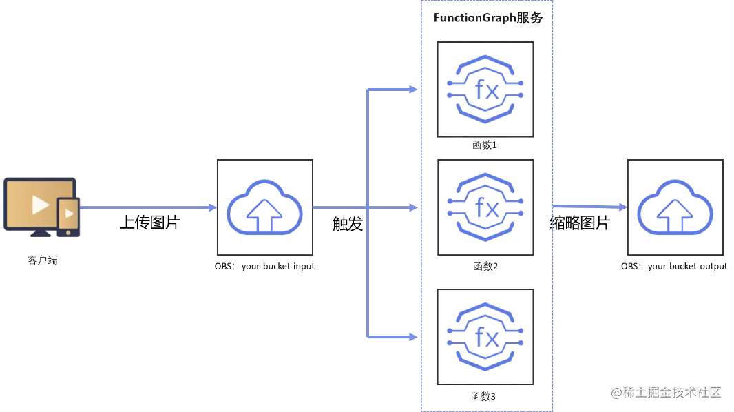 OBS桶及函数创建以后,可以为函数添加事件源,添加OBS事件源是通过创建OBS触发器实现的。当用户将一张照片上传到存储桶时,OBS存储桶调用FunctionGraph函数,实现读取图像和创建照片缩略图。OBS对象操作触发函数的过程请参考使用 OBS 触发器 。