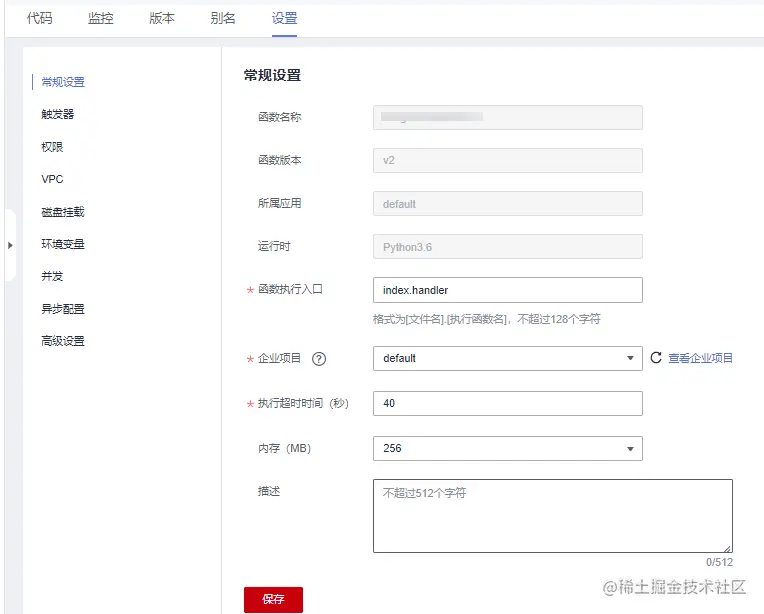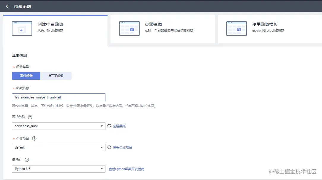 登录函数工作流控制台 ,创建函数,函数名称自定义,委托选择创建委托 中创建的委托,运行时选择“Python3.6”。