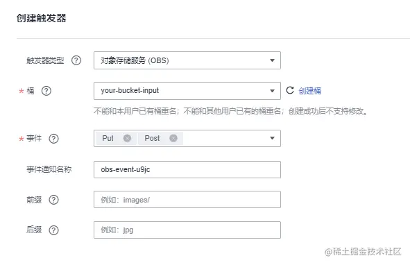 如下图所示,桶选择创建 OBS 桶 中创建的“your-bucket-input”桶。事件选择“Post”、“Put”。