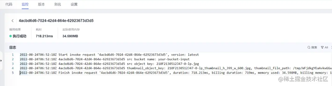 上传图片至your-bucket-input桶,OBS生成事件触发函数运行,将图片压缩,压缩后的图片存放在your-bucket-output桶中。可以在函数详情页日志页签查看函数运行日志,如下图所示。