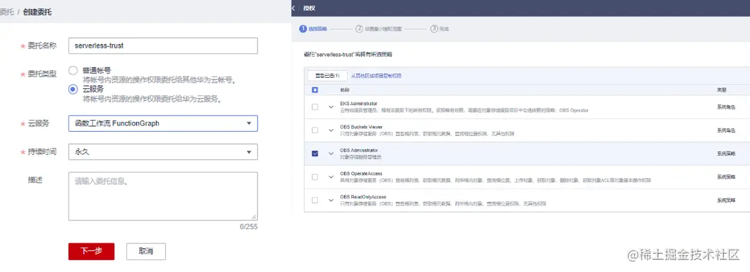 本实践中,在创建函数前,您需要为函数设置拥有OBS访问权限的委托,登录统一身份认证服务控制台 ,按下图创建委托(至少拥有对象存储服务的权限:OBS Administrator)。