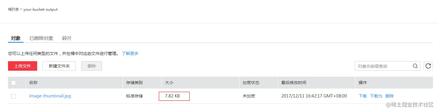 进入your-bucket-output桶对象界面,可以看到压缩后的图片image-thumbnail.jpg,图片大小小于8KB,实现了对图片的压缩,如下图所示。