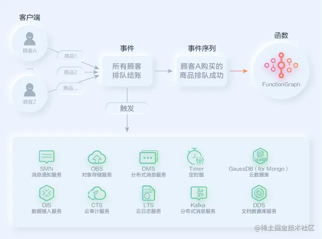 通过事件触发机制,集成多种云服务(SMN,OBS…),满足不同场景需求,获得高效的开发体验。