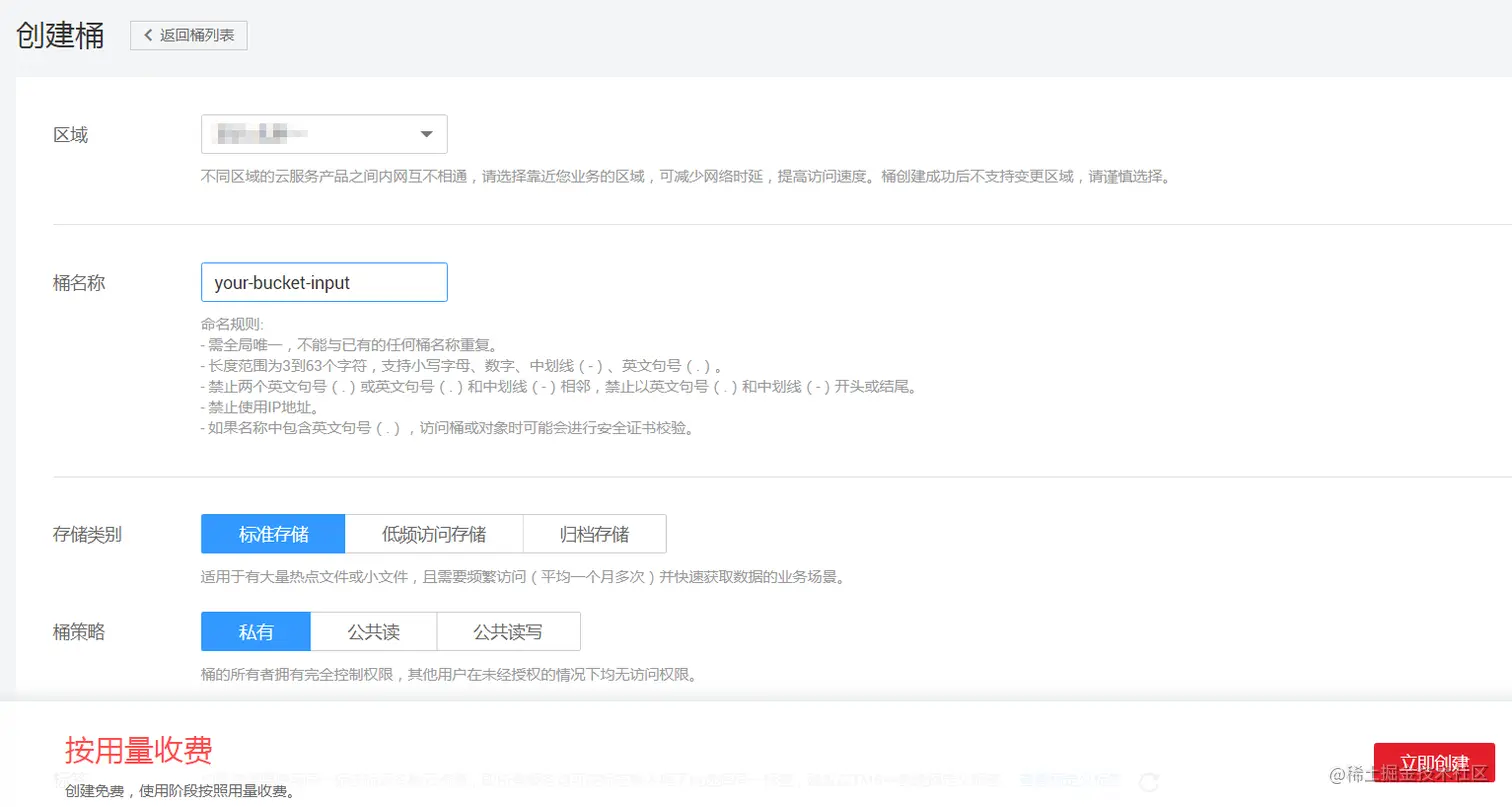 创建两个OBS桶,登录对象存储服务控制台 ,按下图创建桶,“your-bucket-input”用于上传需要处理的图像,“your-bucket-output”用于存储处理后的图像。