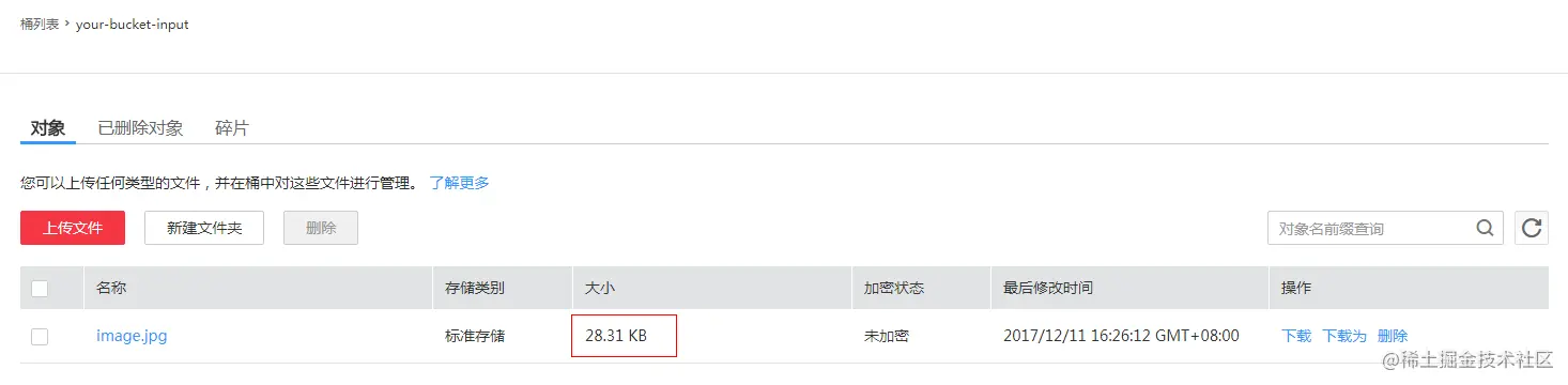 登录对象存储服务控制台 ,进入your-bucket-input桶对象界面,上传image.jpg图片,如下图所示。