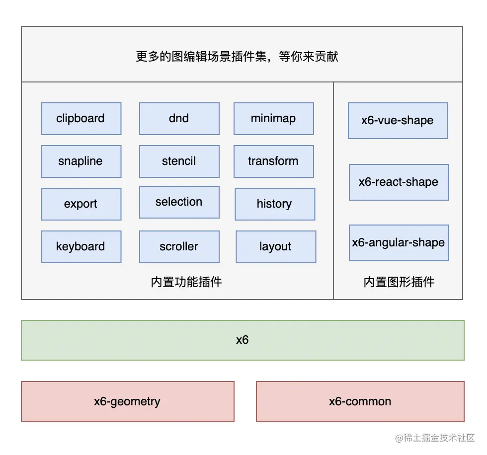更重要的是我们希望通过插件机制,联合社区开发者一起将一些优秀的功能沉淀下来,可以畅想不久之后,X6 具有非常丰富的图编辑场景插件集合,它能大幅降低应用开发成本。