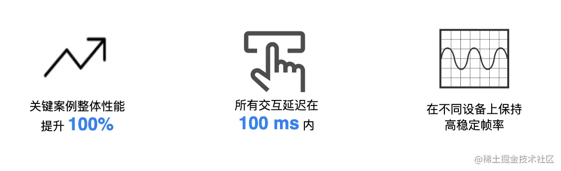 - 渲染性能遇到瓶颈。 随着业务数据的增多,很多开发者反馈,首屏渲染和元素交互越来越卡顿,只有在对应用有足够多的性能分析以及对渲染框架有一定的了解的基础上,采取一些具有挑战性的工程实践,才能达到理想的性能。