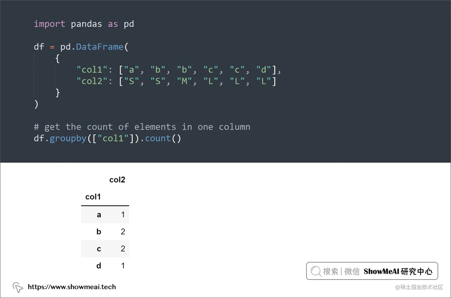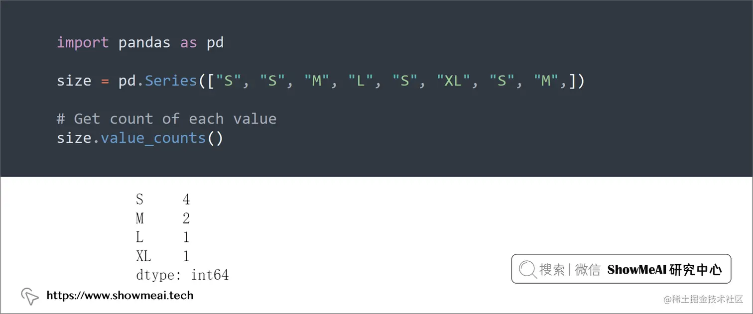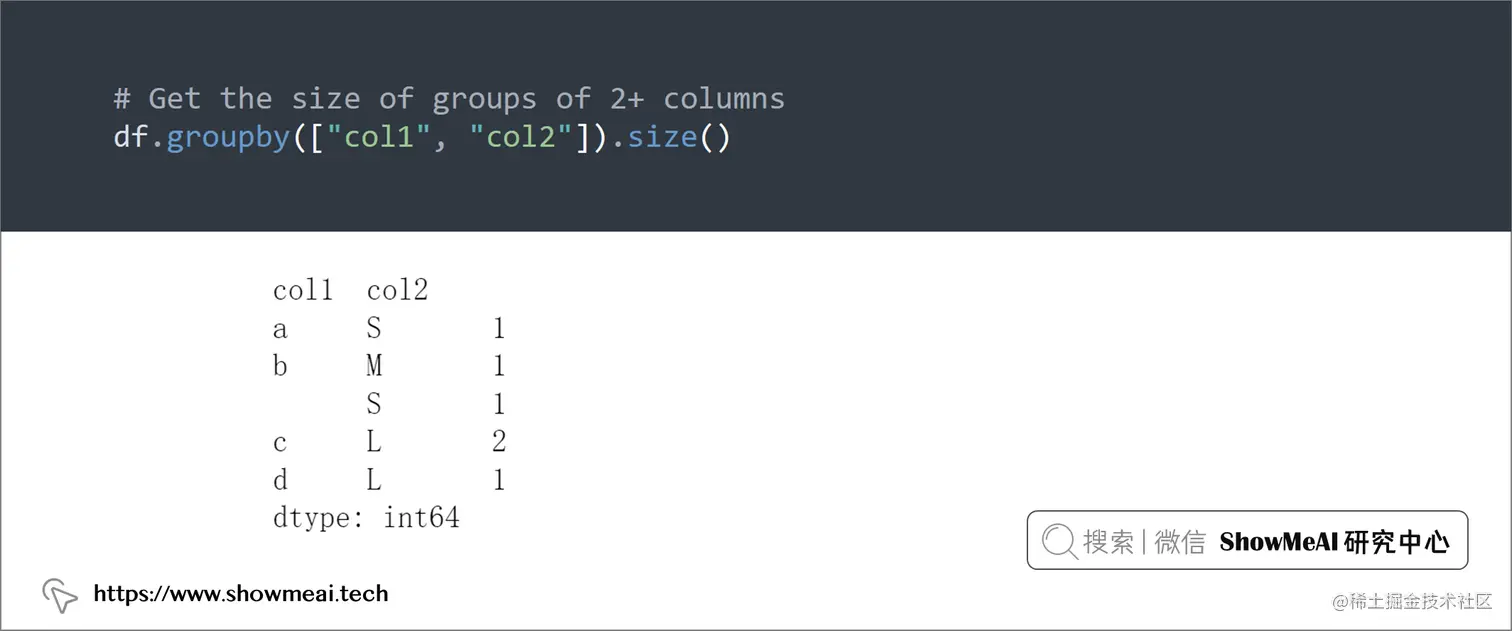 如果你想获得 Pandas 的一列的计数统计,可以使用groupby和count组合,如果要获取2列或更多列组成的分组的计数,可以使用groupby和size组合。如下所示: