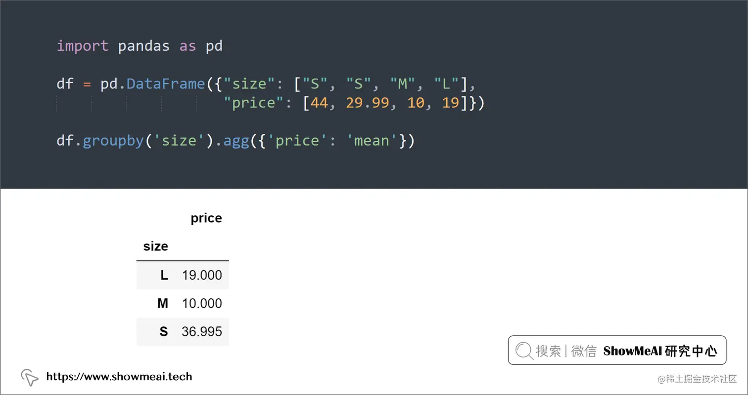 df.groupby('size').agg({'price': 'mean'})