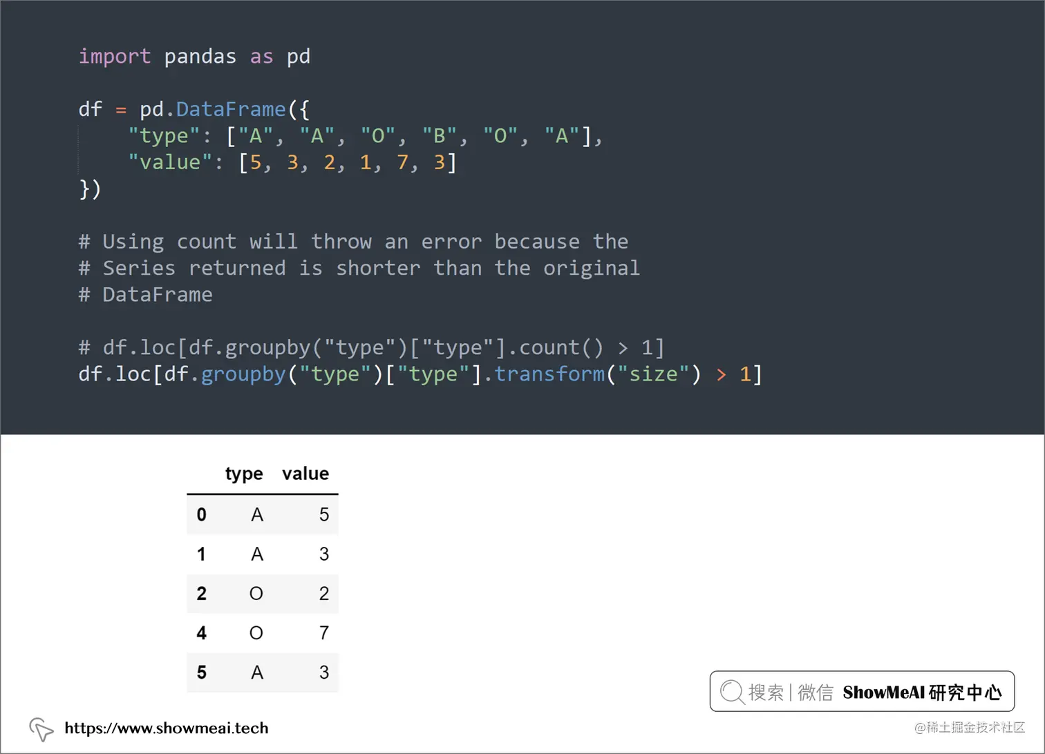 如下例所示,如果我们要对列的取值统计并进行计数过滤,使用count会报错,使用transform是恰当的方法,如下例所示:
