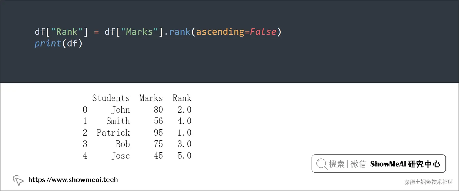 df["Rank"] = df["Marks"].rank(ascending=False)